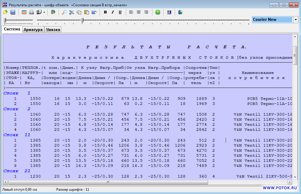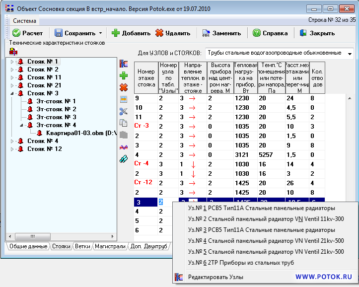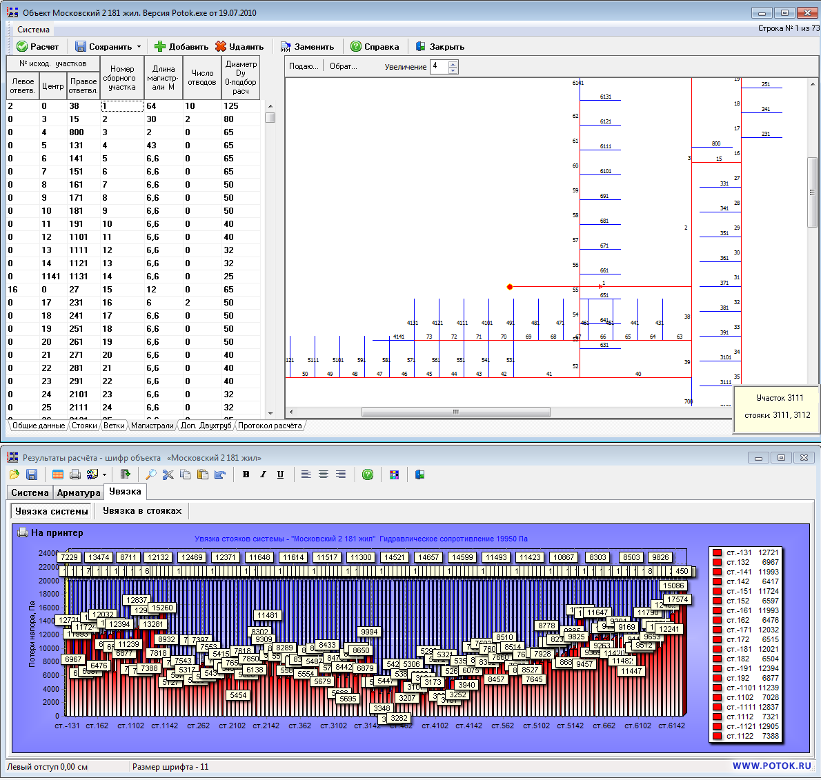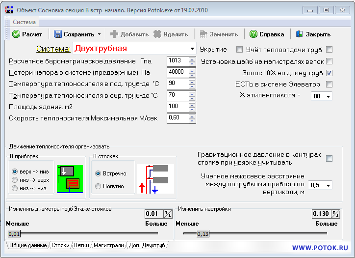 Программа ПОТОК предназначена  для выполнения теплогидравлического расчета 1-2 трубных, коллекторных (плинтусных, лучевых) систем теплохолодоснабжения или центрального водяного отопления теплоносителем — вода или раствор, с постоянным или скользящим перепадом температур (в случаи присоединения потребителей по однотрубной системе) в зданиях любого назначения с централизованным или раздельным теплоучётом.